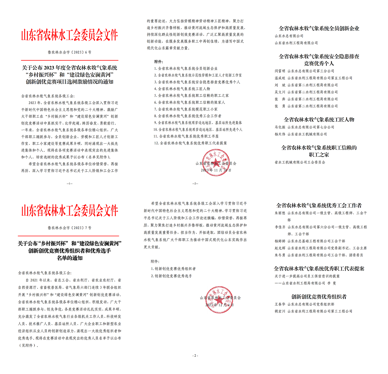 近日,山東水總、山東水局在山東省農林水工會組織的山東省農林水牧氣象系統(tǒng)“鄉(xiāng)村振興杯”創(chuàng)新創(chuàng)優(yōu)競賽中獲多項榮譽。其中,山東水總、山東水局獲“全省農林水牧氣象系統(tǒng)全員創(chuàng)新企業(yè)”稱號,山東水總水工機械公司工會獲“職工信賴的職工之家”稱號,閆雷明等16名員工分別獲“安全隱患排查競賽優(yōu)秀個人”“工匠人物”“優(yōu)秀工會工作者”“優(yōu)秀職工代表提案”“創(chuàng)新創(chuàng)優(yōu)競賽優(yōu)秀組織者”等稱號。
