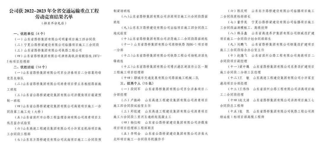 近日,山東省交通運輸廳、山東省總工會聯(lián)合公布了2022-2023年全省交通運輸重點工程勞動競賽結(jié)果,公司在競賽中榮獲4個優(yōu)勝單位、14個優(yōu)勝班組和15名優(yōu)秀個人。